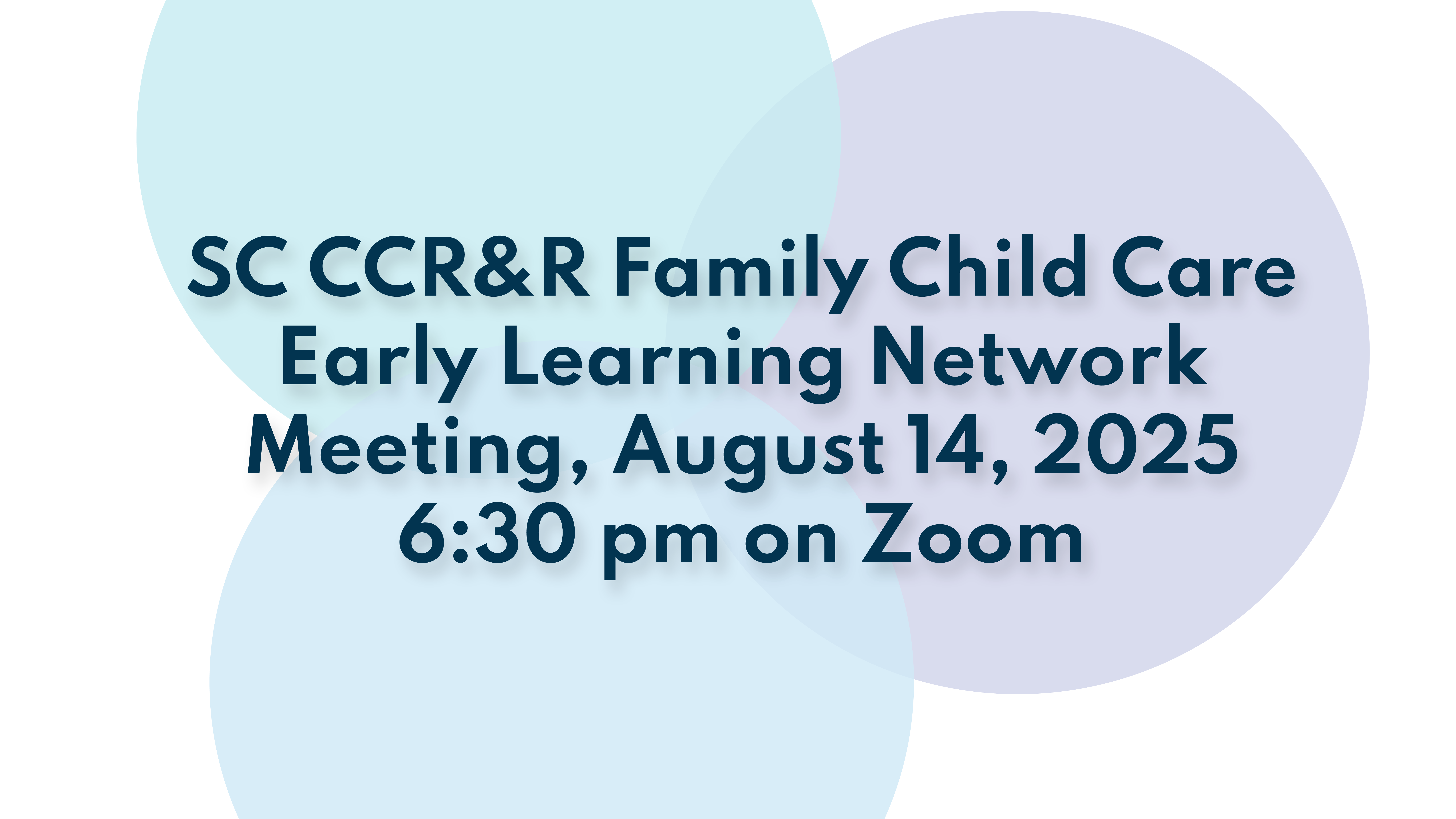 The Family Child Care Network will be meeting on Zoom on August 14th, 2025 from 6:30 pm to 7:30 pm.